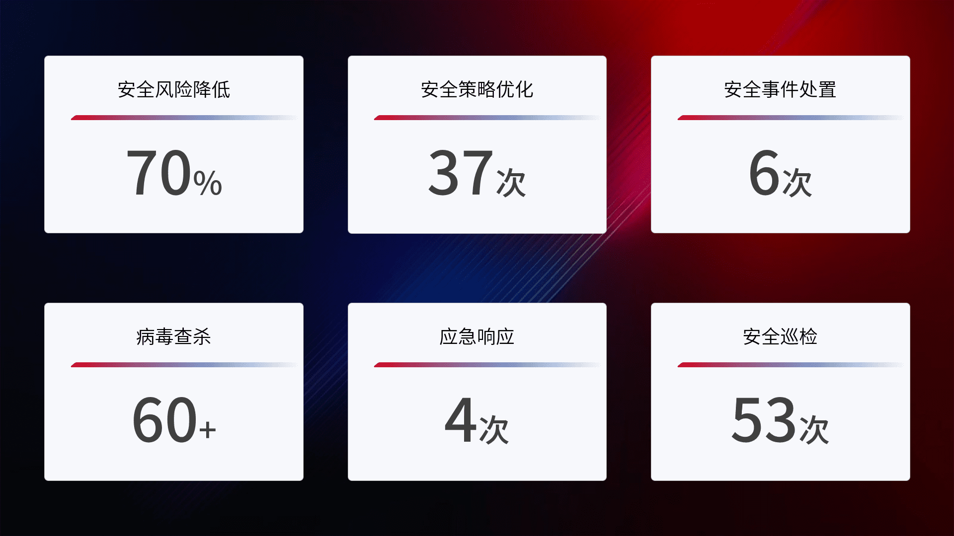 提供全面的安全事件报告体系,,,包括处置报告、、、周报、、、、季度和年度总结,,结合持续监控,,,,帮助客户深入了解网络安全状况。。。。